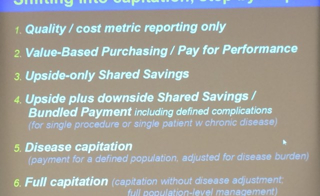 As a consumer – whether tax-payer, patient, employer or insurer, capitation is appealing. A monthly fee is paid regardless of the care needed, used, or delivered. The mystery has been whether hospitals and doctors can survive in that environment. Watching Intermountain executives get up and say they want capitation yesterday, because this transition period is worse and they’re ready. But we know Intermountain. They’re practicality there – they said 70-90% of their business now is capitated. But they’re not alone. Virginia Mason, a large group practice in Washington State affiliated with University of Washington who gets 70-90% of their business in fee for service said they’re ready for capitation now too! Even if most places don’t think they can make it in that environment, the few getting up to say they can will likely pick up the “business” and have a flood of others coming in to learn how it can be done.
